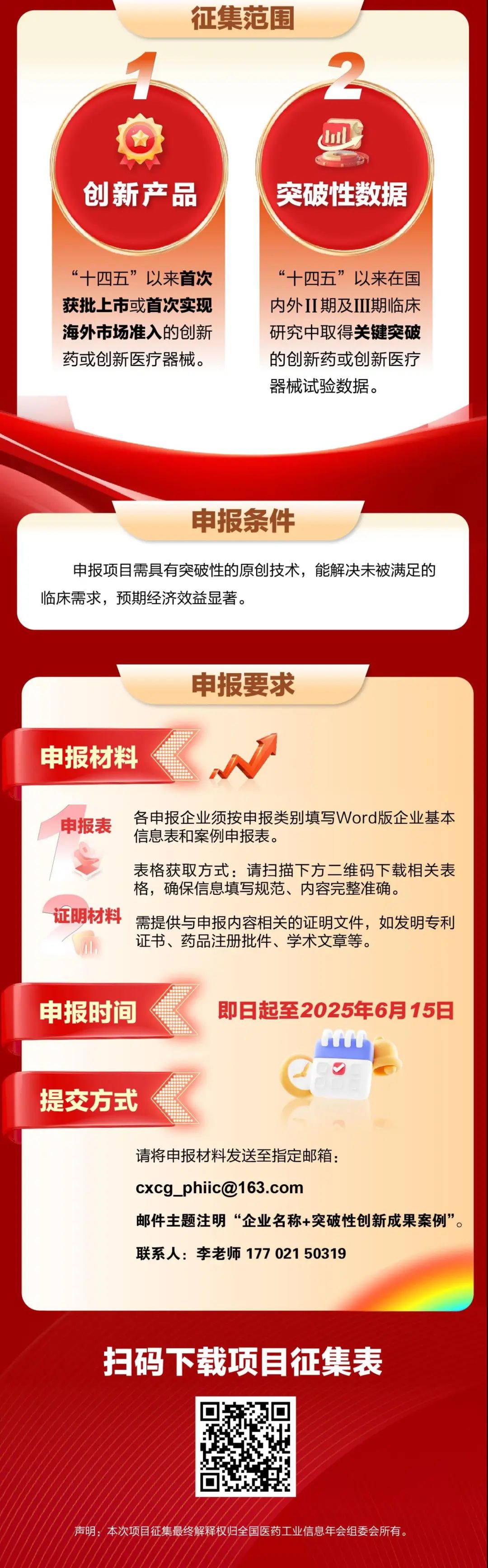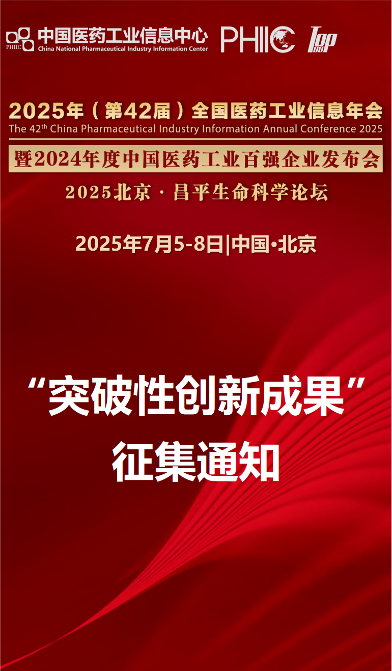 为贯彻落实国家创新驱动发展战略,加速医药领域科技成果转化,树立行业创新标杆,中国医药工业信息中心拟于2025年(第42届)全国医药工业信息年会暨2024年度中国医药工业百强企业发布会上进行突破性创新成果发布,以助力企业提升品牌影响力、加速创新成果快速转化,现面向行业企业征集案例。