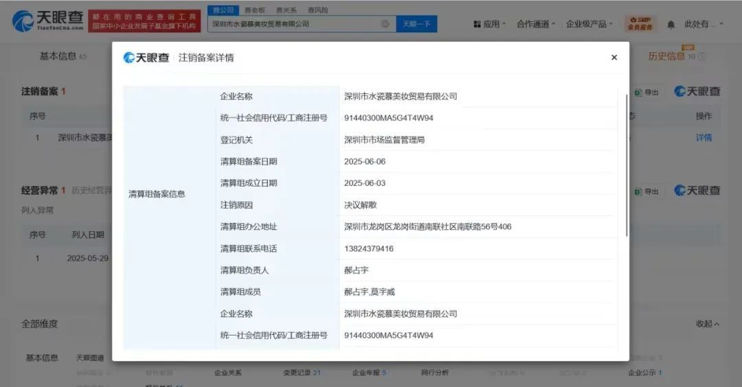 值得注意的是,5月14日,黄杨钿甜父亲杨伟卸任深圳市水瓷慕美妆贸易有限公司(曾用名:益善堂(深圳)生物科技有限公司)法定代表人、执行董事、总经理并退出股东行列,同时司玲霞卸任监事。近日,该公司因通过登记的住所或者经营场所无法联系,被深圳市市场监督管理局龙岗监管局列入经营异常名录。